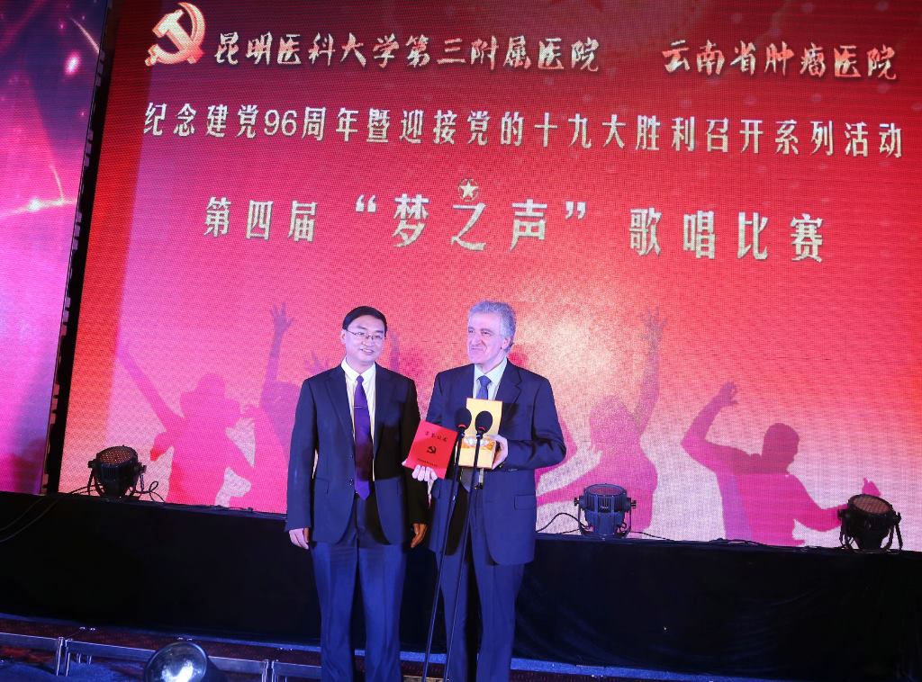 比赛当晚,参会领导为我院党、团先进集体及个人颁发了奖项。获得学校2015—2017年度“先进基层党组织”、“优秀党务工作者”、“优秀共产党员”以及在学校和医院庆祝建党96周年暨迎接党的十九大胜利召开系列活动之“我是党课主讲人”微党课比赛中获奖的代表上台接受表彰。同时获得2016年度共青团云南省委“云南省五四红旗团委”荣誉称号及昆明医科大学2016年度共青团“创先争优”先进集体、优秀个人的代表也上台接受了表彰。会上,医院还特别向在我院开设培训班,传授标本快速现场评估技术(Rapid On Site Evaluation, ROSE)的意大利锡耶纳大学Giuseppe Marciano教授颁发了优秀外籍教师奖。