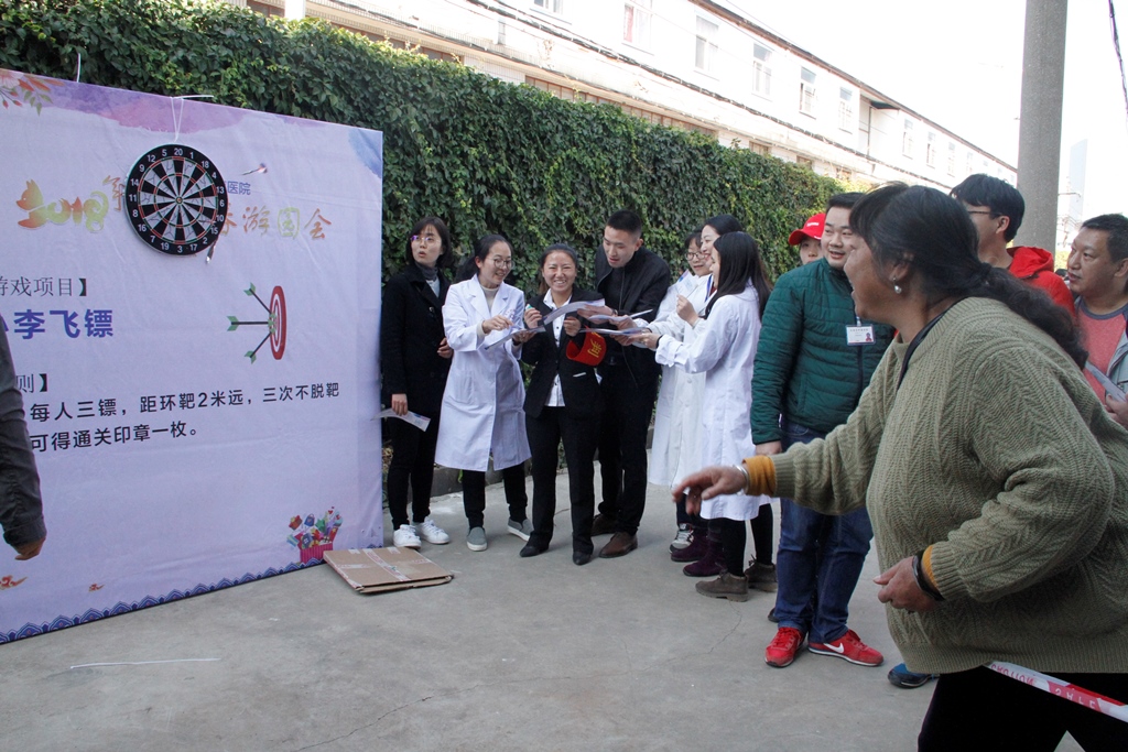 此次游园活动内容丰富多彩,小李飞镖、乾坤小挪移、超级保龄球、吹乒乓球、二人三足、盲人敲鼓、无敌幸运圈、背靠背、掌上明珠、投篮、吹牛皮大比拼、蒙眼画鼻子、铁环障碍赛、钓鱼、比比谁的运气好、照镜子过河、易拉罐积木、海底捞月、打地鼠、迷你高尔夫等项目。奖品种类繁多,每位职工都积极参与到活动中,赢得了心仪的小奖品。活动现场热闹的气氛吸引了不少病人及病人家属驻足观看,有的患者及家属甚至亲自参与到游戏中,实现了医患同乐,共同迎接狗年春节的到来。