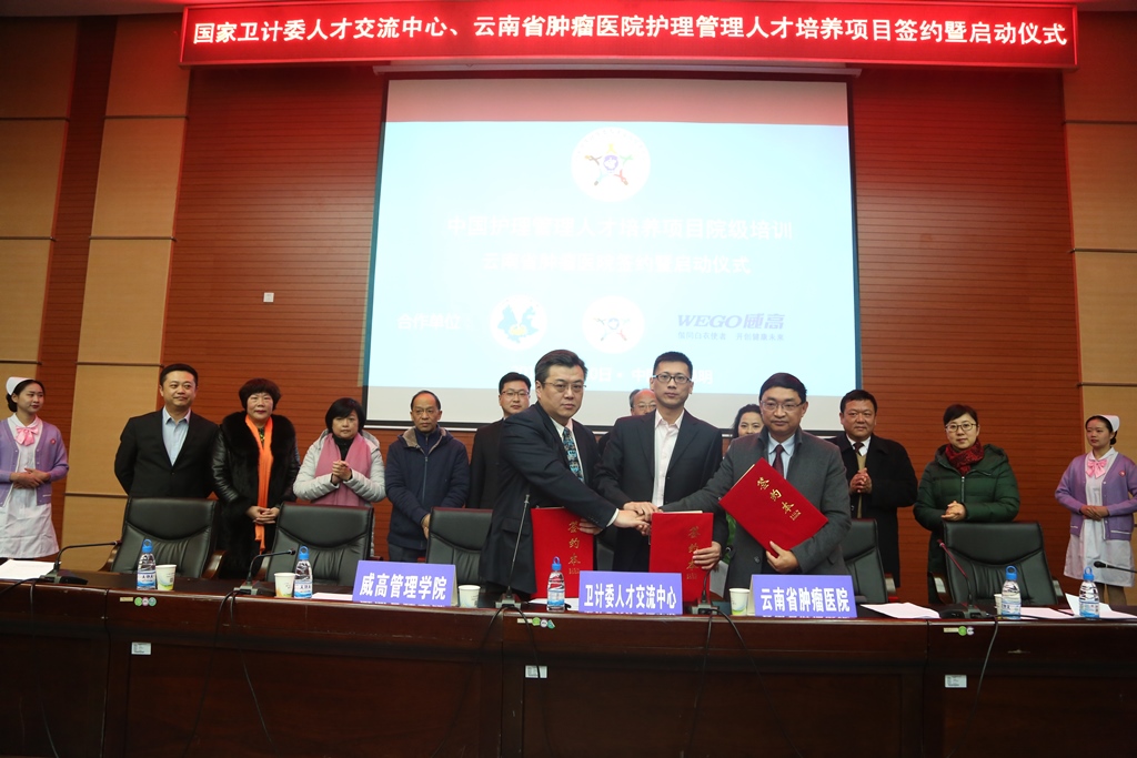 1月10日,“中国护理管理人才培养项目”签约暨启动仪式在我院举行。国家卫生计生委人才交流服务中心、北京卫人伟业国际医药研究中心项目官员李方处长,威高集团管理学院王充院长,昆明医科大学副校长兼医院党委书记吴红明,医院院长黄云超,党委副书记刘志敏,副院长李高峰、李文辉、董坚,纪委书记徐源,医院党委组织员、云南省护理学会理事长秦亚辉及威高集团医用高分子制品股份有限公司丛日楠副总经理及医院临床科室主任、护士长、职能部门负责人和参训人员等参加了签约仪式。李高峰副院长主持签约仪式。